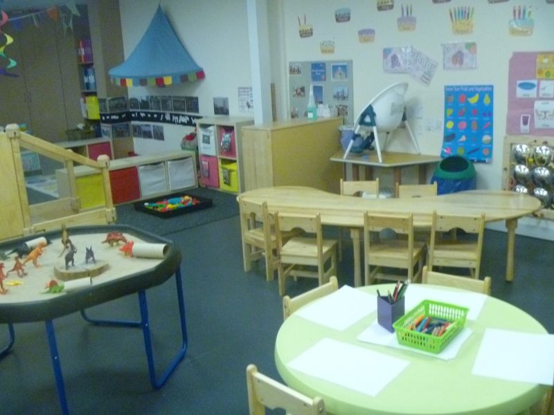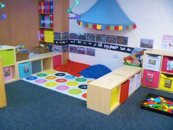 The room itself is split into three areas: A carpeted area for general play, a vinyl floor area for meal times and messy play and a separate area for resting and sleep times.